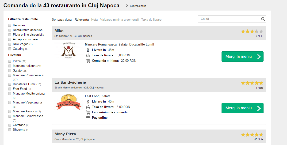 După ce alegi oraşul în care doreşti să comanzi – Cluj-Napoca, Bucureşti, Arad, Braşov, Buzău, Constanţa, Galaţi, Iaşi, Oradea, Ploieşti, Sibiu sau Timişoara – vei putea să fitrezi restaurantele după diferite criterii: dacă sunt deschise, dacă se poate plăti online, dacă acceptă vouchere sau dacă oferă mâncare raw vegan de exemplu.